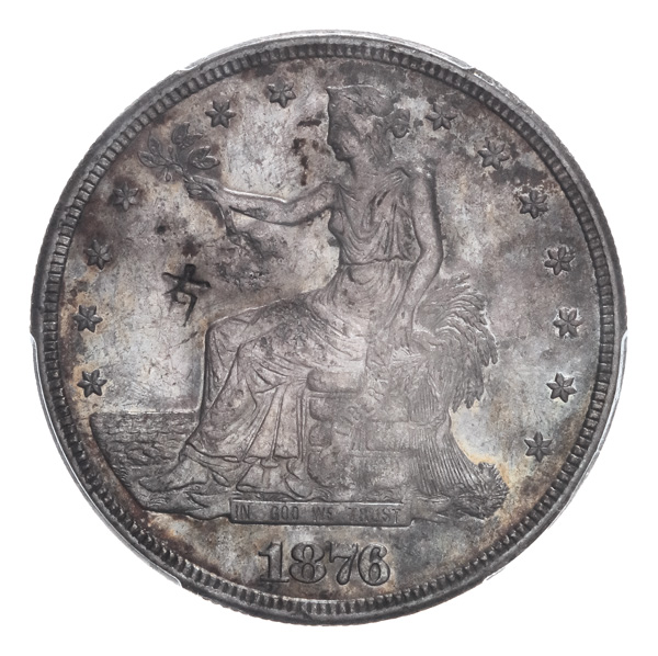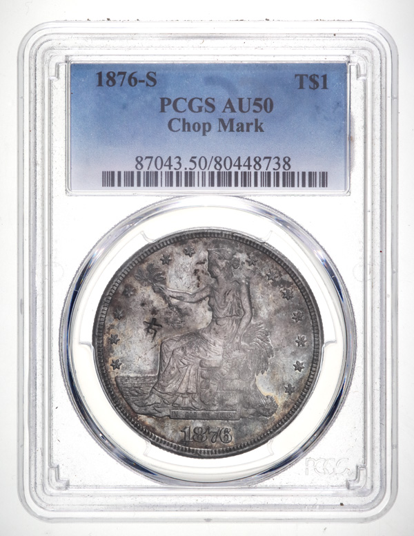 1876-S $1 Trade Silver Dollar PCGS AU50 Chop Mark, PCGS graded About Uncirculated 50. (Image) (Image2)