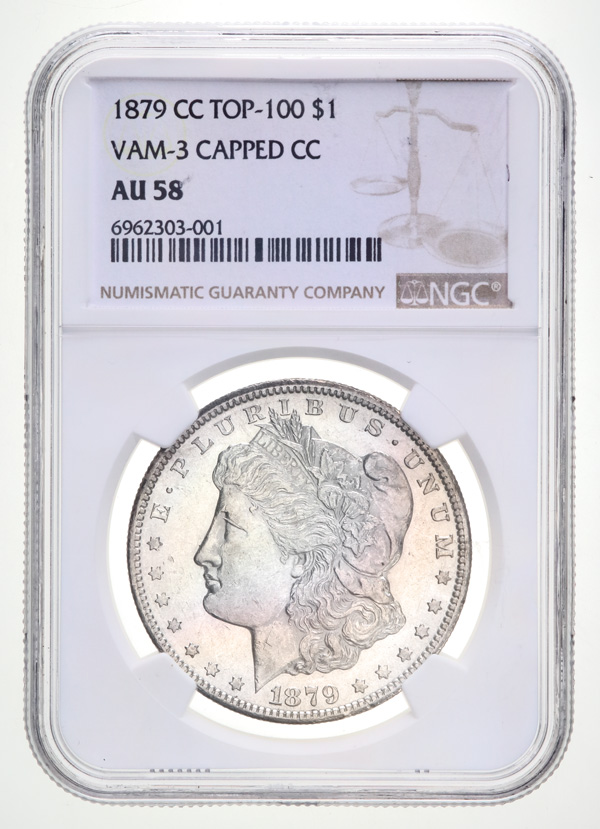 1879-CC Top-100 $1 Morgan Silver Dollar VAM-3 Capped CC NGC AU58, NGC graded About Uncirculated 58. (Image) (Image2)