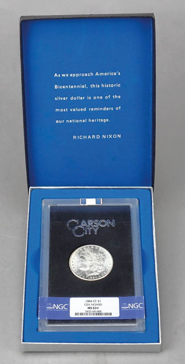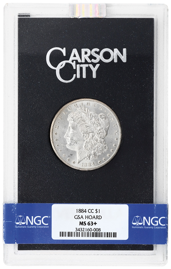 1884-CC, GSA Hoard Carson City $1 Morgan Silver Dollar NGC MS63+, includes original GSA box and certificate, NGC graded Mint