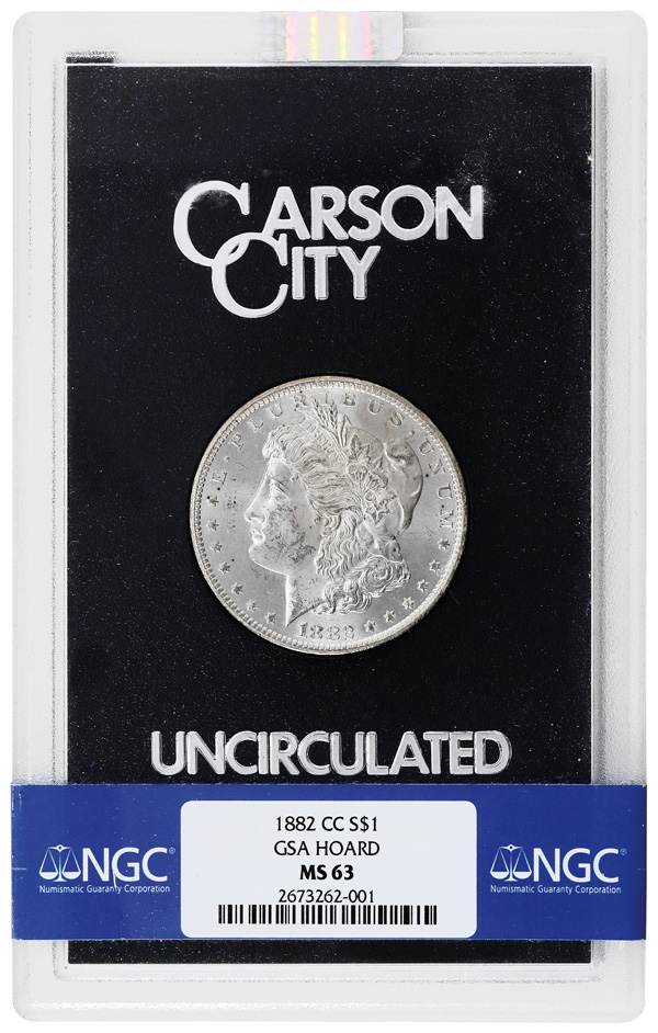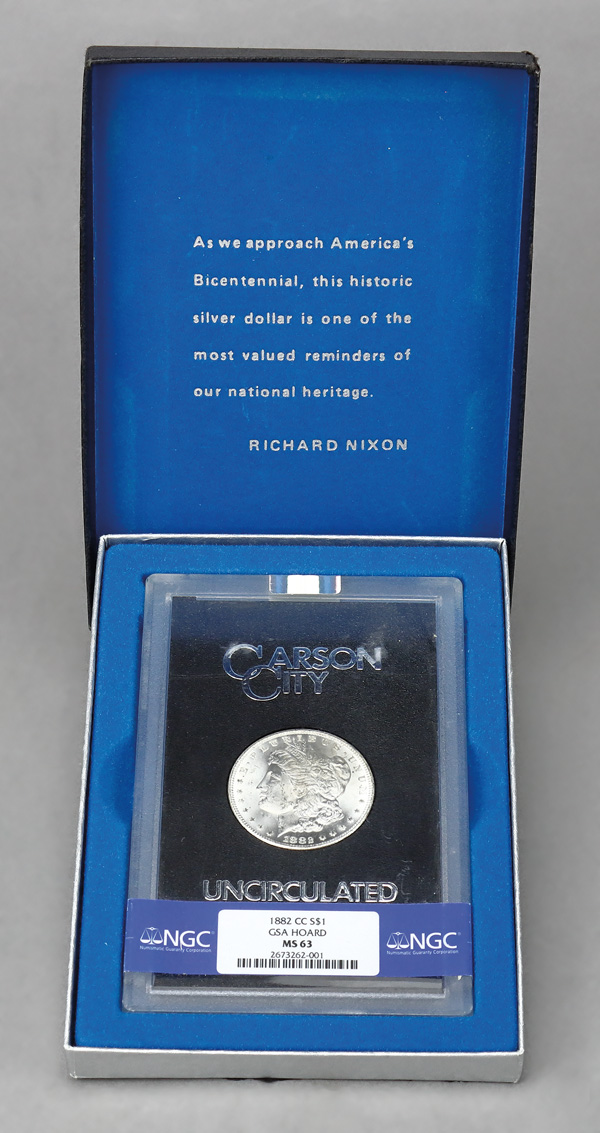 1882-CC, GSA Hoard Carson City $1 Morgan Silver Dollar NGC MS63, includes original GSA box and certificate, Mint State 63.