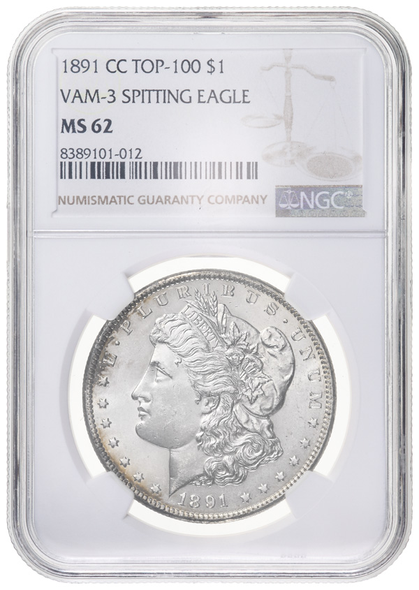 1891-CC TOP-100 $1 Morgan Silver Dollar VAM-3 SPITTING EAGLE NGC MS62, NGC graded Mint State 62. (Image) (Image2)