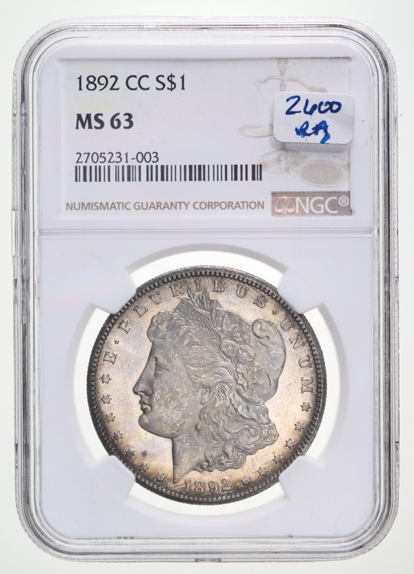 1892-CC $1 Morgan Silver Dollar NGC MS63, NGC graded Mint State 63. (Image) (Image2)