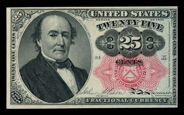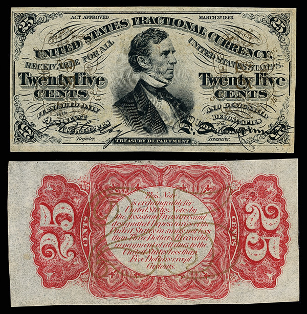 Fr. 1308 25¢ Fifth Issue (Fr-1308), Rothert-137. Portrait of Walker at left, Red seal with long key, back with large 25