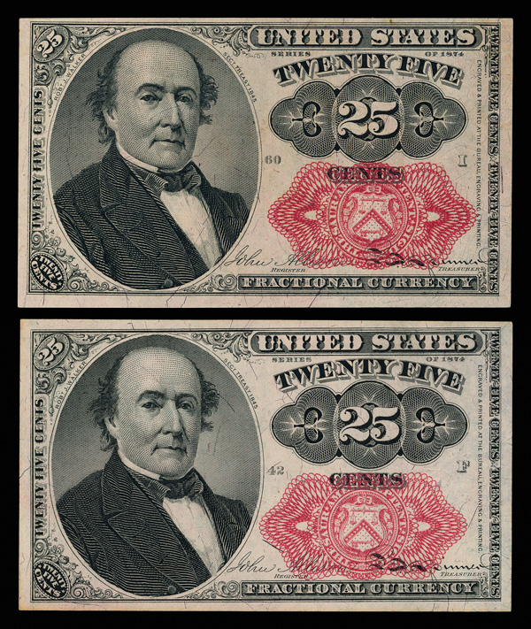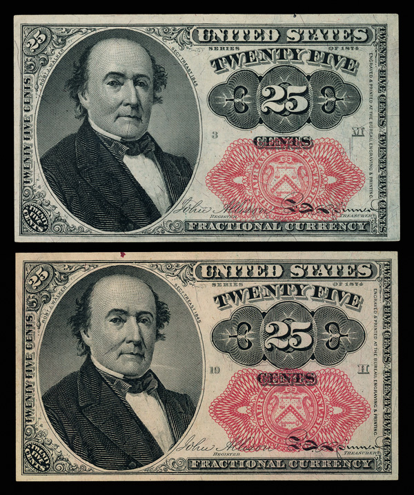 Fr. 1309 25¢ Fifth Issue Fractional Pair (Fr-1309), Rothert-138. Lot of 2 notes, both with Portrait of Walker at left,
