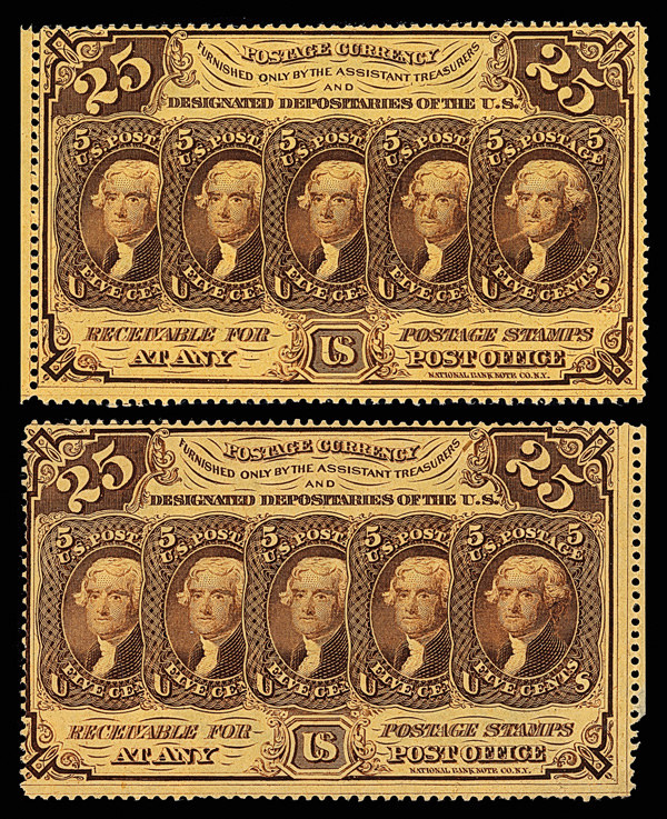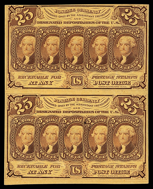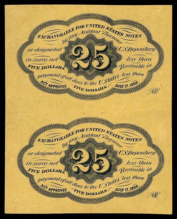 Fr. 1281 25¢ First Issue Straight Edge Uncut Vertical Pair (Fr-1281), Uncut Vertical pair, with ABNC monogram. Brown