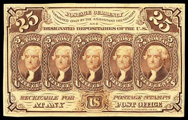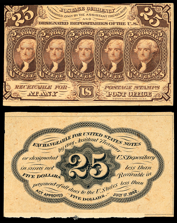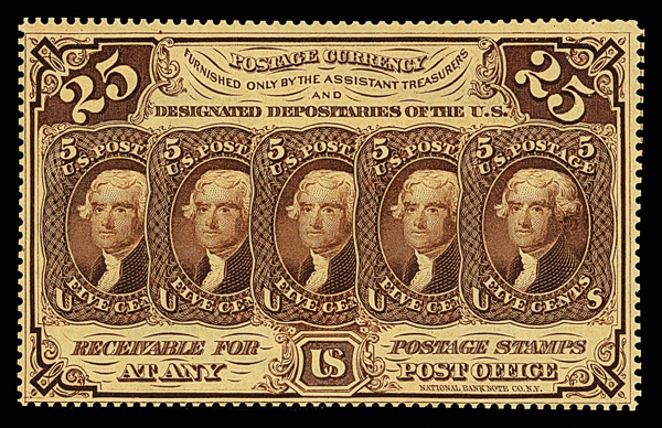 Brown with 5 over lapped U.S. Jefferson 5 Cents Stamps in center. Choice VF to Choice XF condition or better. (Image) (Image2)