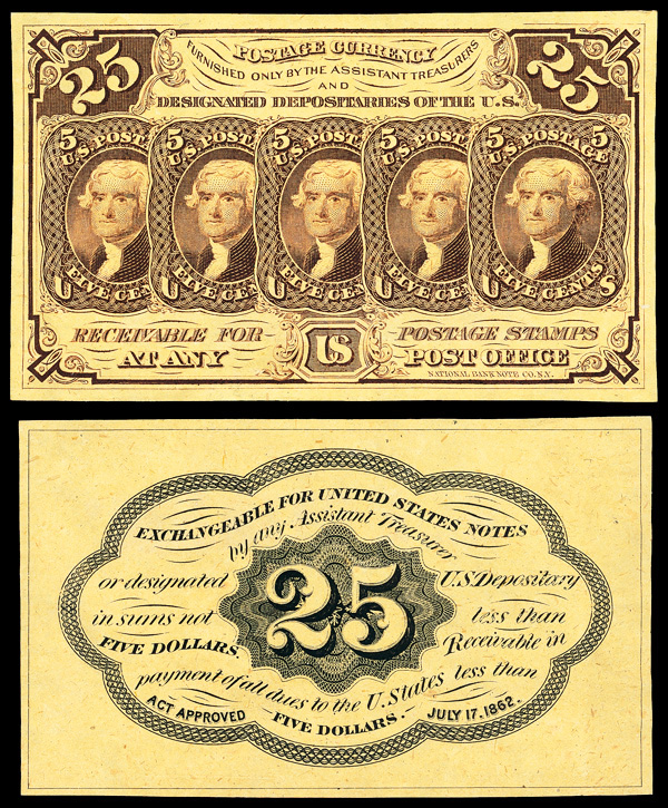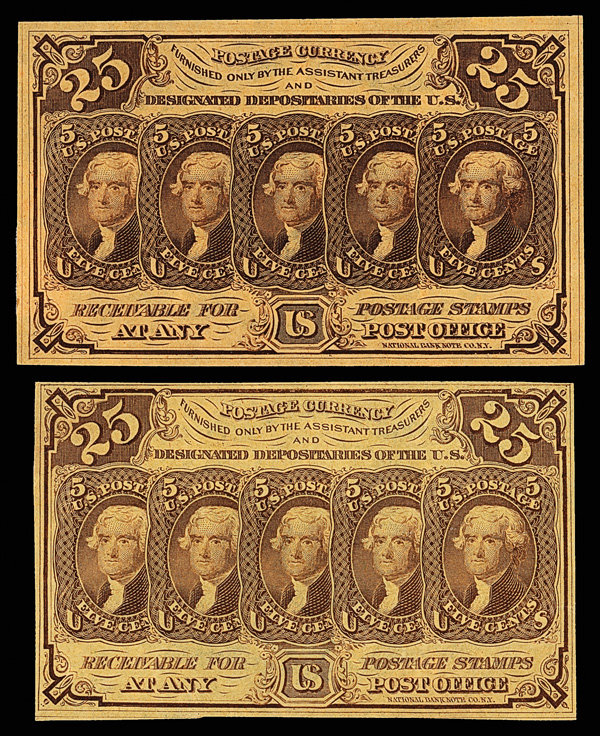 Brown with 5 over lapped U.S. Jefferson 5 Cents Stamps in center, black back. Both are Choice XF to AU condition or better. (Image) (Image2)