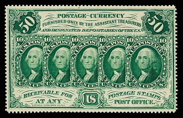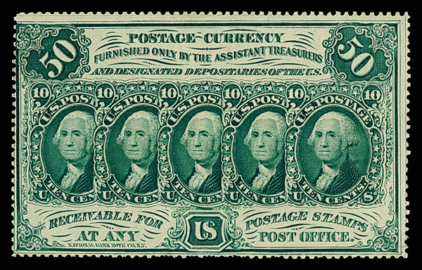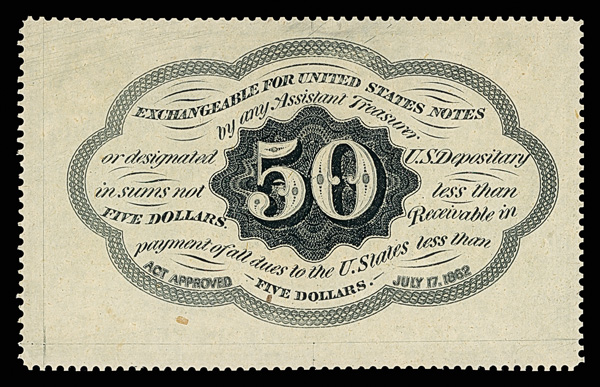 Fr. 1311 50¢ First Issue Perforated Edges (Fr-1311), Rothert-14. Perforated edges, without ABNC monogram, Green with 5
