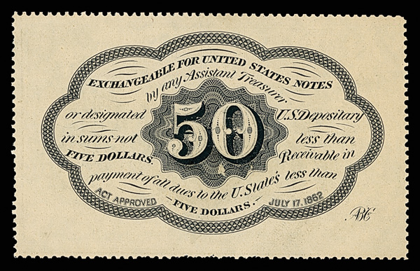 Fr. 1310 50¢ First Issue Perforated Edges (Fr-1310), Rothert-13. Perforated edges, with ABNC monogram, Green with 5