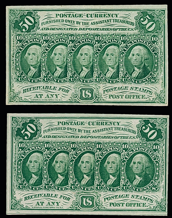 Fr. 1312 50¢ First Issue Straight Edges Pair (Fr-1312), Rothert-15. With ABNC monogram, Green with 5 overlapped 10