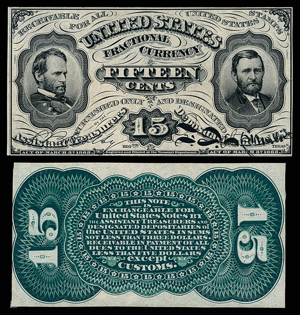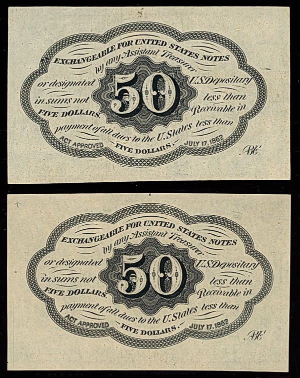 specimen pair of obverse & reverse, Grant & Sherman Portraits, autographed signatures of Colby and Spinner, green reverse, this issue never circulated, Choice XF to AU condition or better. (Image) (Image2)