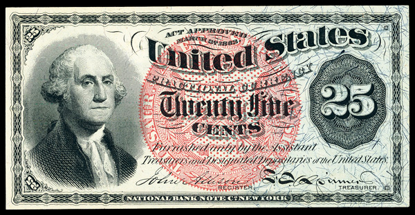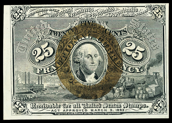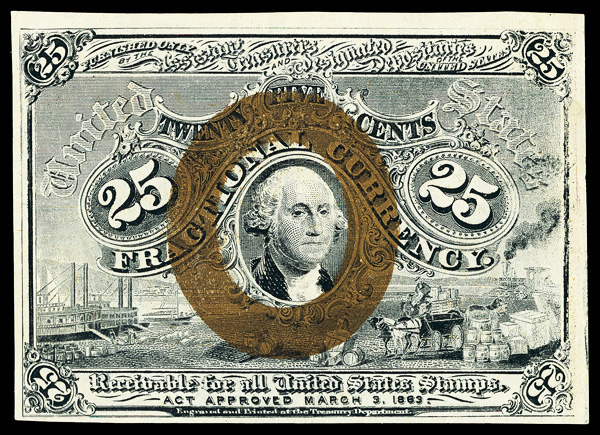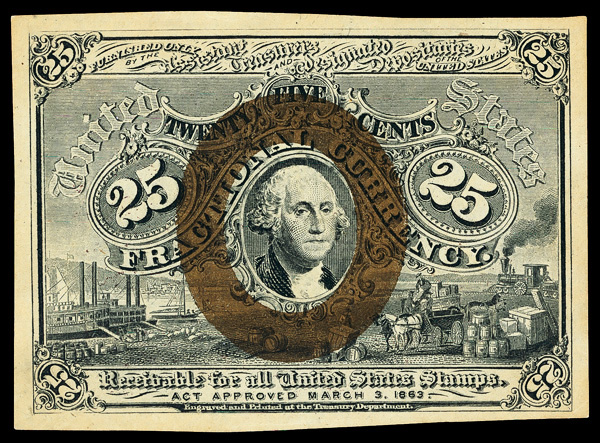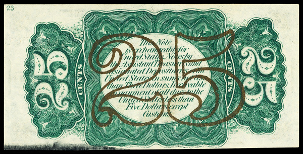 Fr. 1285 25¢ Second Issue (Fr-1285), Rothert-32, Washington at center flanked by 25's, With overprint "18-63"and "A",