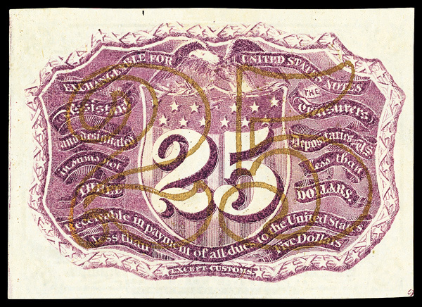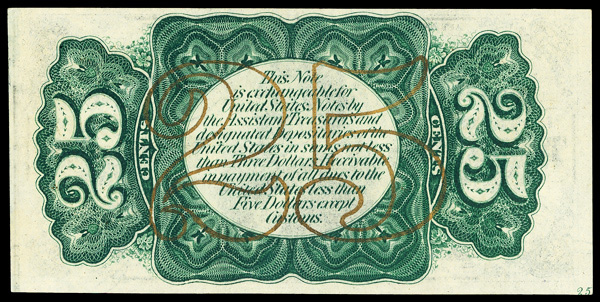 Fr. 1280 25¢ First Issue Perforated Without Monogram (Fr-1280), Rothert-10. Without ABNC monogram. Brown with 5 over