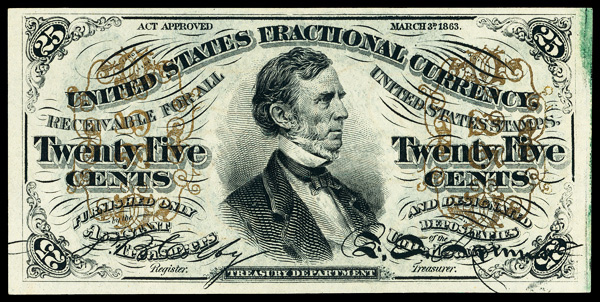 Fr. 1295 25¢ Third Issue (Fr-1295), Rothert-58, Portrait of Fessenden at center, Green reverse, Small "a" at lower left