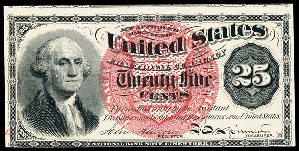 Fr. 1307 25¢ Fourth Issue (Fr-1307), Rothert-128. Portrait of Washington at left, Small 38mm pink (light red) seal,
