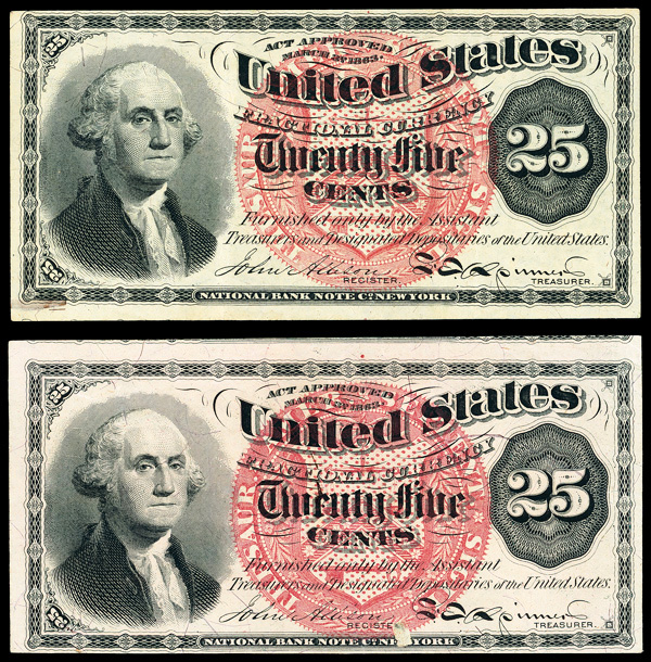 Fr. 1303 25¢ Fourth Issue Fractional Pair (Fr-1303), Rothert-126. Lot of 2 notes, both with Portrait of Washington at