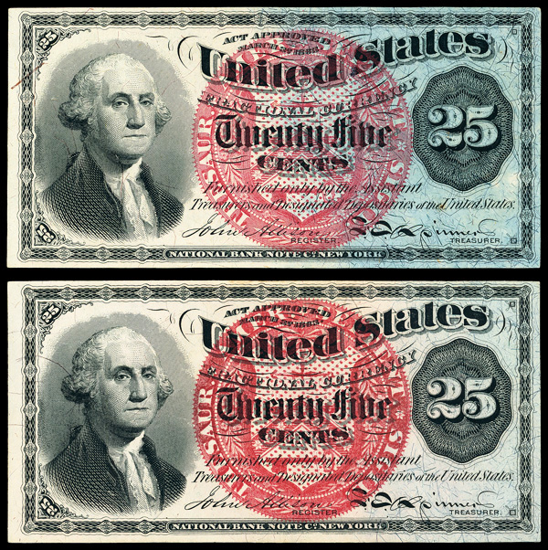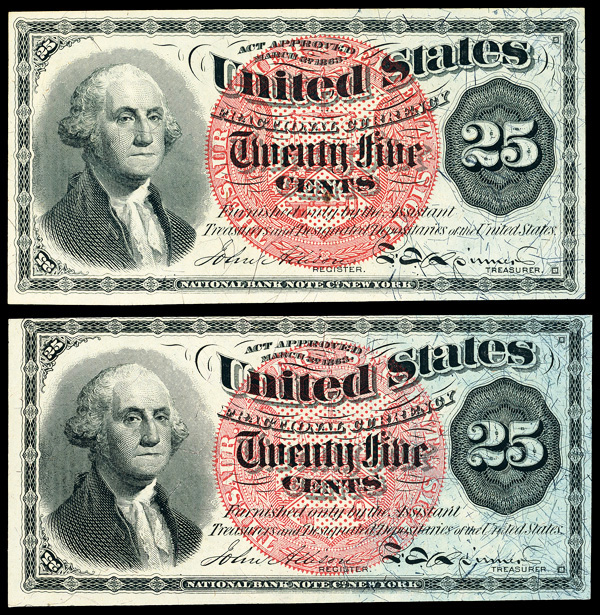 Fr. 1309 (1309A Paper Color Variant) 25¢ Fifth Issue with Pink Color Tinge on Obverse Fractional Pair (Fr-1309A),