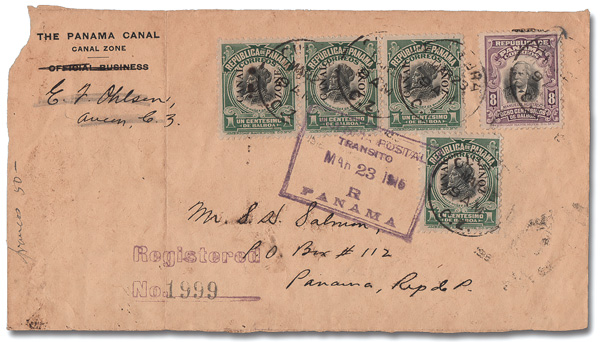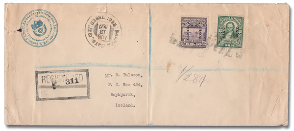 1791 cover 60, 63 image1921 1c green & 10c violet (Scott 60, 63), tied on a legal size cover from Balboa Heights to Reykjavik, Iceland, sent unsealed Registered mail with a "Balboa Hgts., C.Z./ Registered, Aug 13, 1923" c.d.s. and backstamps Cristobal (Aug 13), New York (Aug 22), London (Aug 29), Edinburgh (Aug 30), and Reykjavik (Sep 6); also bears sender's blue circular "International League" return address handstamp; central vertical file fold, small tear at the upper left, Fine. (Image) (Image2) (All Images)