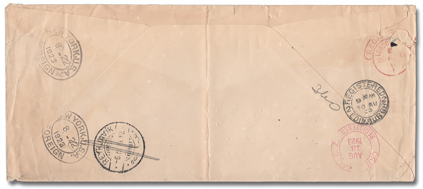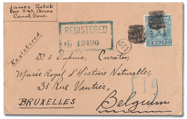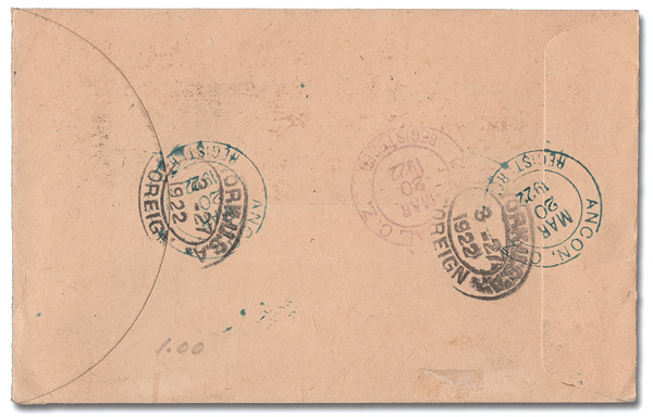 1798 cover 64 image1921, 15c Statue of Balboa (Scott 64), tied by small square grids on a 1922 Registered cover from Ancon to Brussels, Belgium; backstamped Ancon and Cristobal, Mar 20, and New York, Mar 27; no Belian markings. (Image) (Image2) (All Images)