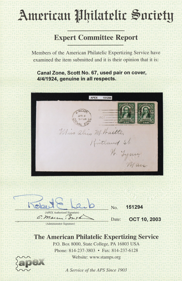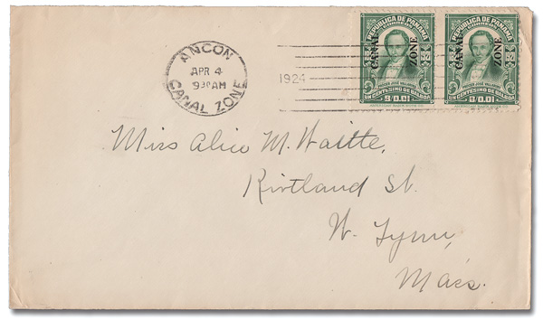 1799 cover 67 image1924, 1c Vallarino, Mount Hope type III overprint (Scott 67), horizontal pair tied by an Ancon machine cancel, Apr 4, 1924, on a clean cover to W. Lynn, Mass.; stamps with perfs just into design at the right, cover Very Fine, with a 2003 A.P.S. certificate.