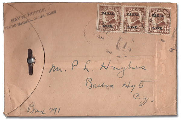 1804 cover 72 image1925, 1½¢ Harding, flat "A" (Scott 72), strip of 3 tied by weak Pedro Miguel duplex handstamps, Aug 24, 1925, on a small clasp envelope that carried an automobile radiator emblem via 3rd Class mail, Very Fine. (Image) (Image2) (All Images)
