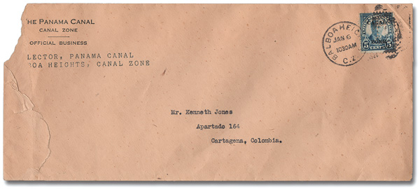 1806 cover 74 var. image1924, 5¢ Roosevelt, flat "A", Perforated "P" (Scott 74 var.), tied by a clear Balboa Heights duplex handstamp, Jan 6, 1926, on a legal size "Collector, Panama Canal" Official Business envelope to Cartagena, Colombia; opened raggedly at the left with small piece missing, otherwise Very Fine.
