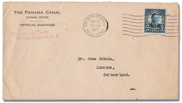 1805 cover 74 var. image1924, 5¢ Roosevelt, flat "A", Perforated "P" (Scott 74 var.), tied by a clear Balboa Heights machine cancel, Jan 20, 1927, on a "Director of Posts" Official Business envelope to Luzern, Switzerland, Very Fine.