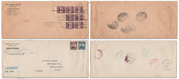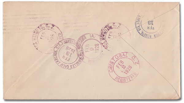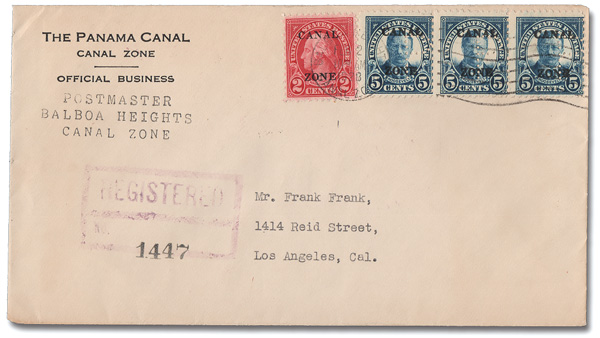 1807 cover 74 var. image1924, 5¢ Roosevelt, flat "A", Perforated "P" (Scott 74 var.), strip of 3 used with a 2¢ Washington (101), tied by a Balboa Heights machine cancel, Feb 2, 1929, on a "Postmaster, Balboa Heights" Official Business envelope to Los Angeles, Cal.; violet boxed Registered No. handstamp and backstamped Balboa Heights & Cristobal, Feb 2, Los Angeles (Arcade Sta.), Feb 12, and Los Angeles (Pico Heights Sta.), Feb 13; "P" perfins about Fine, centering-wise, otherwise Extremely Fine. A rare use of a 5¢ "P" perfin multiple, paying the 15¢ registration fee.