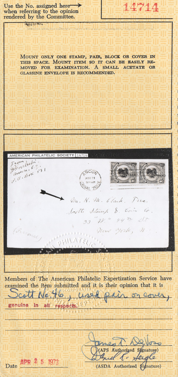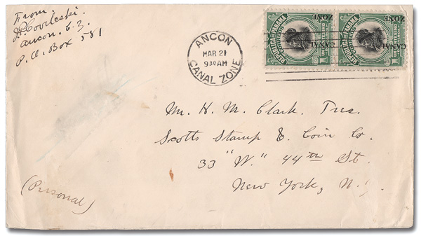1784 cover 46 var. image1915, 1c green & black, shifted type III overprint type III overprint (Scott 46 var.), vertical pair with overprint shifted slightly to the right, but dramatically downward with "C" touching the bottom perforations, th an Ancon mcanc, Mar 21, 1922; couple tiny edge tears and erased blue pencil to left of address, Fine to Very Fine and very rare, with a 1973 A.P.S. certificate.