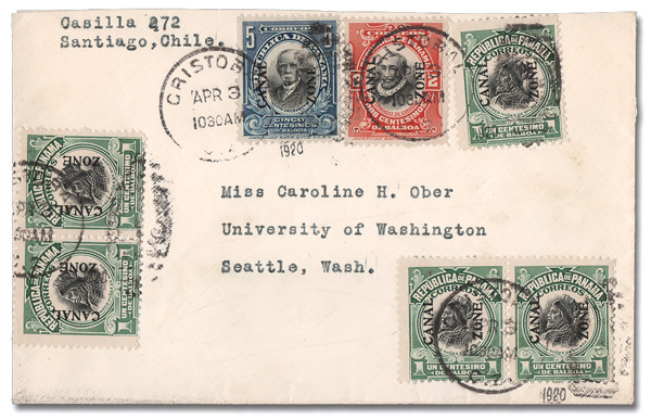 1785 cover 48 image1915, 5c Arosemena, deep blue & black, type III overprint (Scott 48), used with five 1c type IV & a 2¢ type IV (52, 53) on a cover to Seattle, Wash. tied by Cristobal duplex handstamps, Apr 3, 1920; typed return address to Santiago, Chile; possibly intended to be sent Registered as 12¢ would have been correct postage, Very Fine.