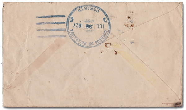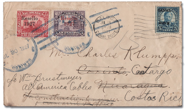 1820 cover 86 var. image1926, 5¢ Roosevelt, sharp "A", wrong font "CANAL", Forwarded cover (Scott 86 var.), tied by a Balboa machine cancel, Jul 18, 1927, on a cover to Corinto, Nicaragua and backstamped there on Jul 28; redirected to Cartago, Costa Rica with Nicaraguan 1c & 2c stamps tied by blue Jul 30 duplex handstamps; reduced slightly at the right, Fine to Very Fine.
