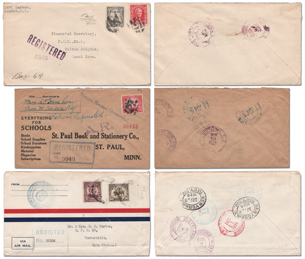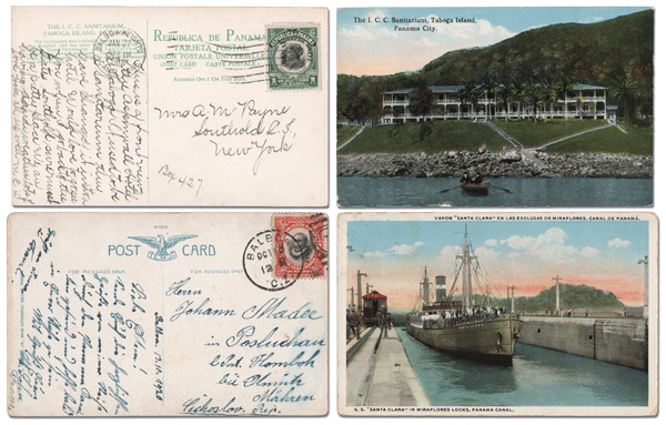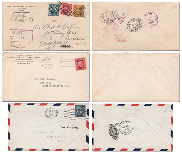 1783 cover 46/47 image1915, 1c & 2c type III overprint, three covers (Scott 46/47), 1.) 1c on a picture postcard, Balboa Heights to Southold, N.Y.; 2.) 2c on a picture postcard, Balboa to Czechoslovakia; and 3.) 1c strip of 3 & single used with a Panama 8c Hurtado (213) on a Registered cover front only from Culebra to Panama City. (Image) (Image2) (All Images)