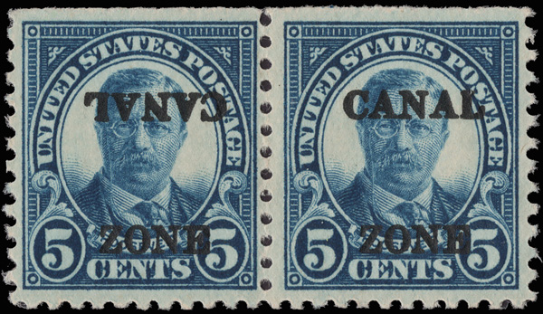 1818 og 86b image1926, 5¢ Theodore Roosevelt, sharp "A", "CANAL" inverted (Scott 86b), the left stamp in a pair with normal, tropicalized o.g. (never hinged), straight edge at the top as always (the variety only occurs at position 7 of the lower right pane), Very Fine. Only about 30 examples are recorded.