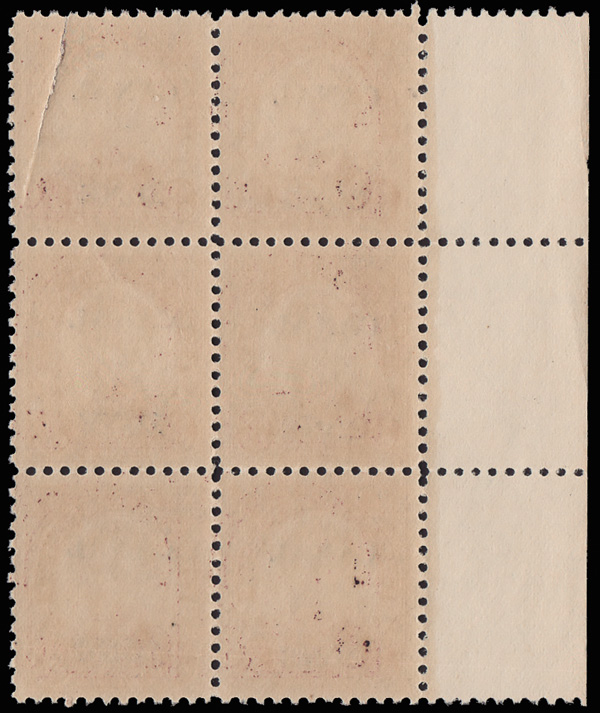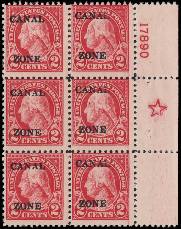 1808 ogbl 84 image1926, 2¢ Washington, sharp "A" (Scott 84), right sheet margin block of 6 with plate no. 17890 opposite the top stamp and the large 5-point star opposite the middle stamp, o.g., very lightly hinged, the overprint on the left stamps is 1mm lower than those on the right, exceptionally fresh; perfs just touch at the top, Fine. Not, strictly speaking, a plate block, but rare, nonetheless.