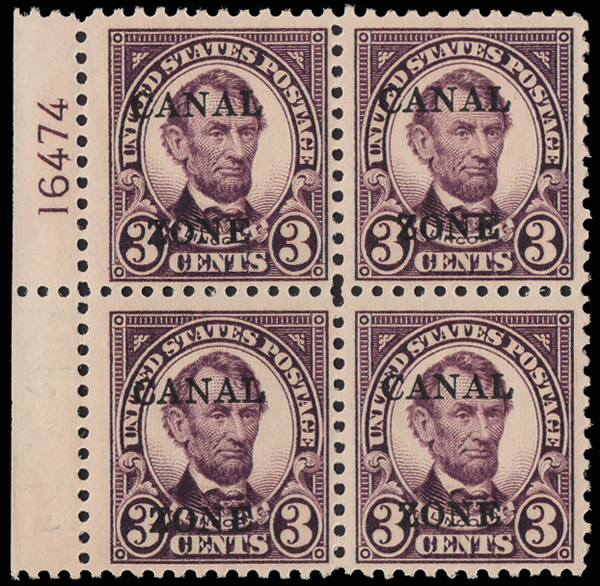 1815 ogbl 85 var. image1925, 3¢ Lincoln, sharp "A", "CANAL" in wrong font (Scott 85 var.), the lower left stamp in a left sheet margin block of 4 with plate no. 16474, o.g., lightly hinged, Very Fine.