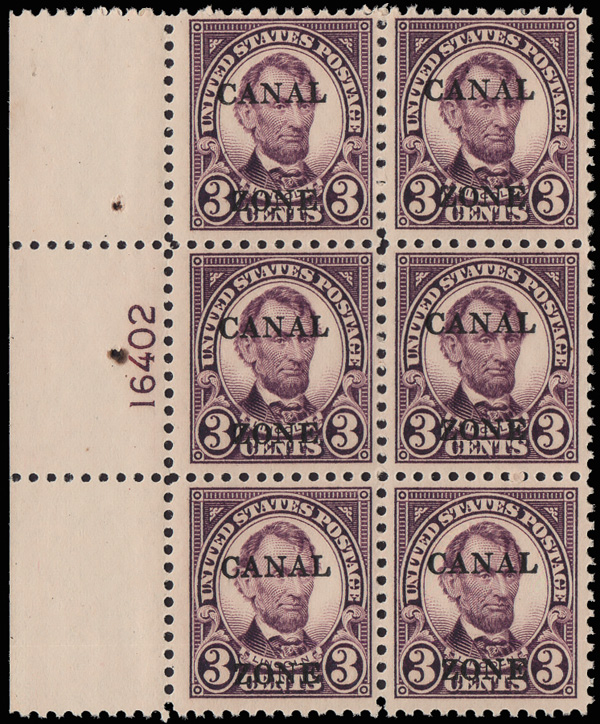 1814 nhbl 85 var. image1925, 3¢ Lincoln, sharp "A", "CANAL" in wrong font (Scott 85 var.), the lower left stamp in a left plate no. 16402 block of 6 with full selvage, o.g., never hinged (!), Very Fine.