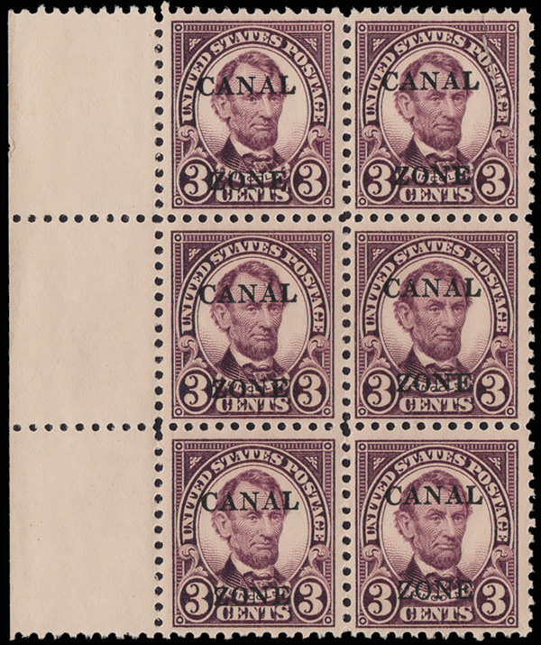1816 nhbl 85 var. image1925, 3¢ Lincoln, sharp "A", "ZONE" in wrong font (Scott 85 var.), the lower right stamp in a left sheet margin block of 6, o.g., never hinged, fresh and nicely centered; the upper left stamp with a crese/tear, the variety is Fine to Very Fine.