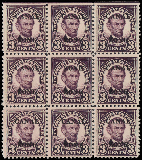 1812 ogbl 85a image1925, 3¢ Lincoln, sharp "A", "ZONE ZONE" (Scott 85a), the middle stamp in a top row block of 9 from a lower right pane of 100 (posns 7-9/27-29)), tropicalized (dry) o.g., bright and fresh, Fine to Very Fine.