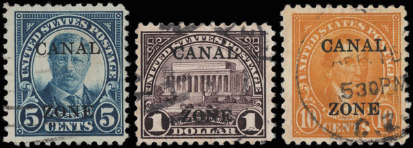 1817 O 86, 87 & 95 vars. image1926, 5¢, 10¢ & $1, sharp "A", "CANAL" in wrong font (Scott 86, 87 & 95 vars.), fresh and light canceled, Fine to Very Fine.