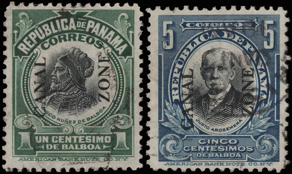 1782 O 46, 48 vars. image1915, 1c Balboa & 5c Arosemena, type III overprint, "E" under "L" (Scott 46, 48 vars.), lightly canceled used examples, Fine to Very Fine. This variety occurs at just three positions in the sheet.