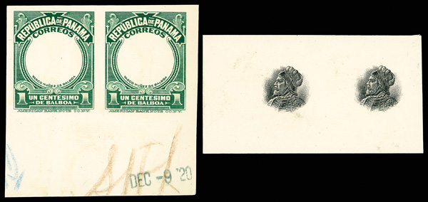 1786 P 52 image1c Vasco Nunez de Balboa, Panama issue plate proofs of the frame only and the center only, pairs, horizontal pairs, the frame with large bottom selvage with "DEC-9 '20" handstamp as well as brown and blue manuscript, the center with wide sheet selvage at left, Very Fine.