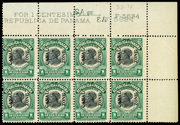 1787 nhbl 52 image1918, 1c Balboa, green & black, type IV overprint (Scott 52), top right corner block of 10 with F5684 in black and green along with other marginal markings, fresh and full never hinged o.g. bright color, vignette with proof-quality impression, strong overprint; light diagonal crease in selvage, Fine.