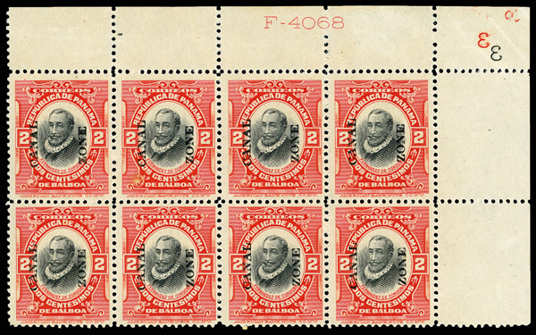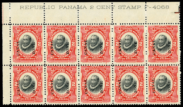 1789 nhbl 53 image1918, 2c Córdoba, vermilion & black, type IV overprint (Scott 53), top left corner block of 10 with "Republic Panama 2 Cent Stamp F-4068" in black in top selvage, fresh and full never hinged o.g. vivid shade and strong vignette impression with bold overprinnt on bright white paper, Fine to Very Fine.