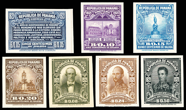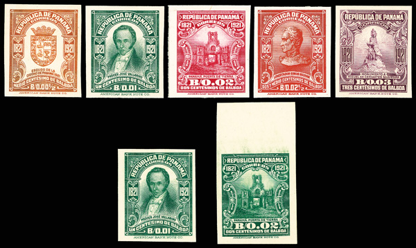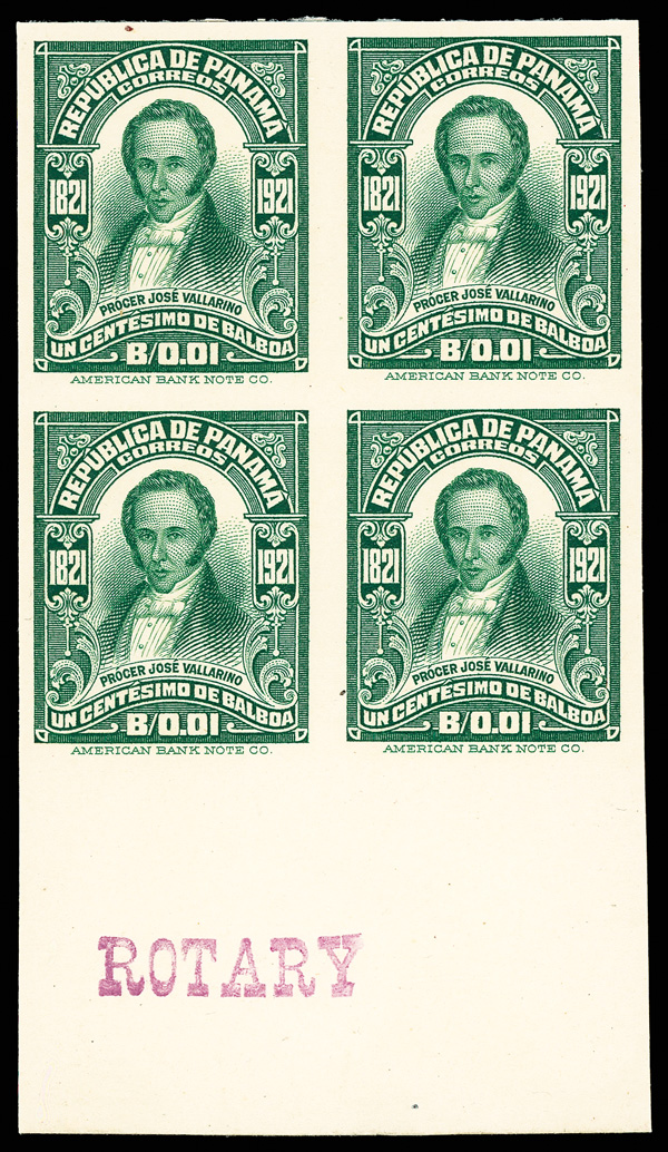 1792 P 60-67 vars image1921, Centenary of Panama Independence, complete set of plate proofs on cards with booklet panes and bonus (Scott 60-67 vars), set of 12, also includes 1¢ Villarino block of four with wide bottom selvage with purple "ROTARY", a trial color proof of the 2c in green and an extra 1c, and booklet panes of the 1c & 2c issues with extra wide selvage at top and bottom, 2c booklet pane with portion of magenta approval handstamp on back, 2c booklet pane with horizontal crease thru bottom pair, still a Very Fine and very scarce group, fully imaged online.