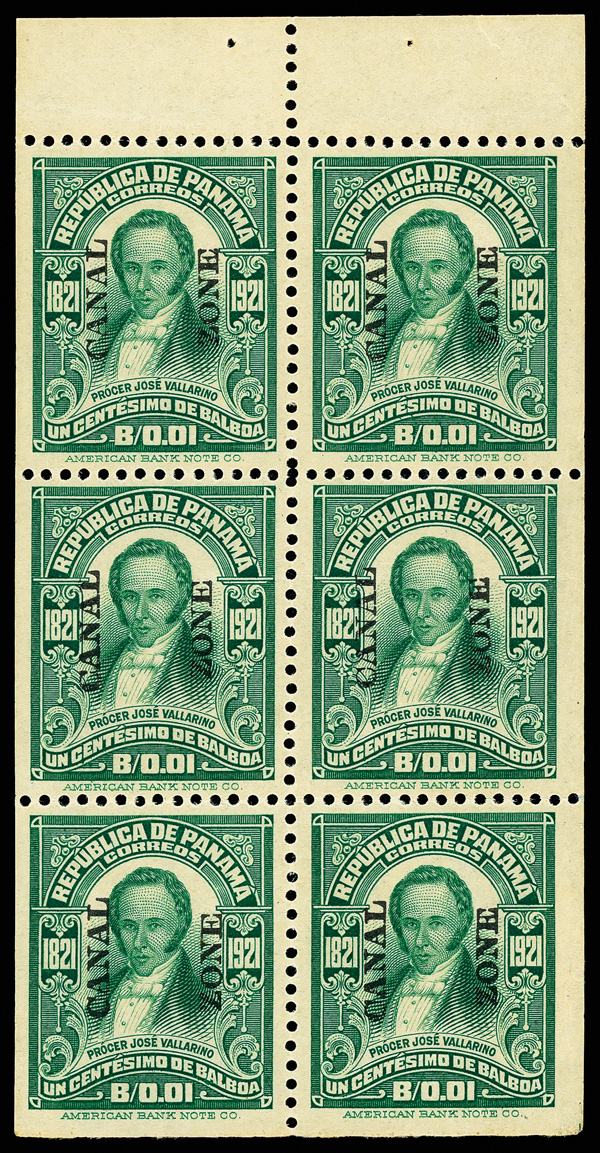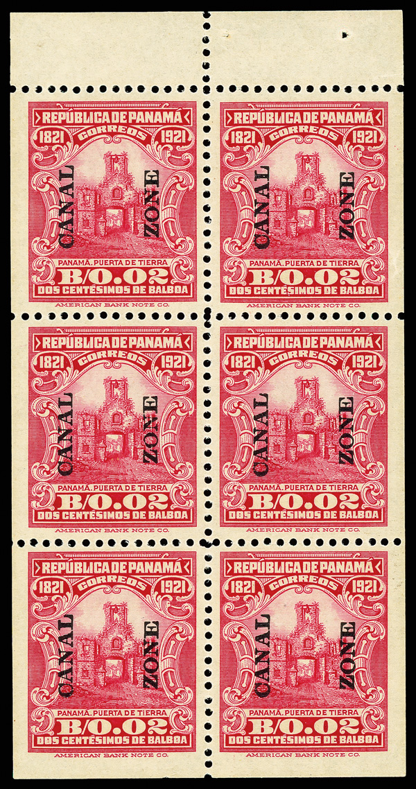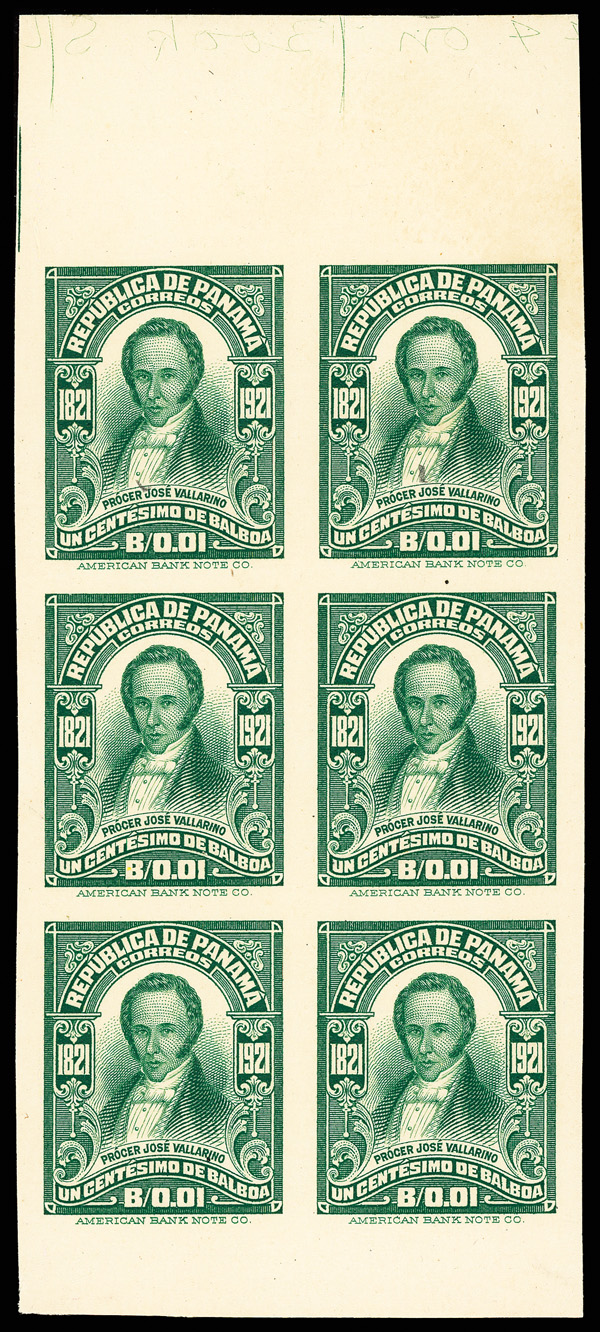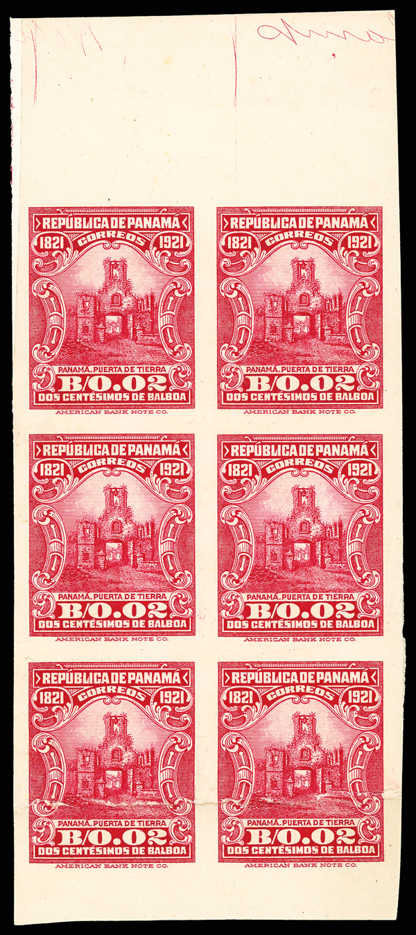 1801 nhbl 69S image1924, 2c Arms of Panama, carmine, left pairs imperforate between (Scott 69S), in top margin block of 6 with plate number F7428, no vertical perfs between left stamps, each stamp with security punch hole at bottom left and red "Specimen" overprint at center, selvage slightly reduced and few perf seps in top selvage reinforced, natural straight edge at right, o.g., never hinged, Extremely Fine, plate number F7428 and plate position noted in pencil on the reverse, and probably unique.