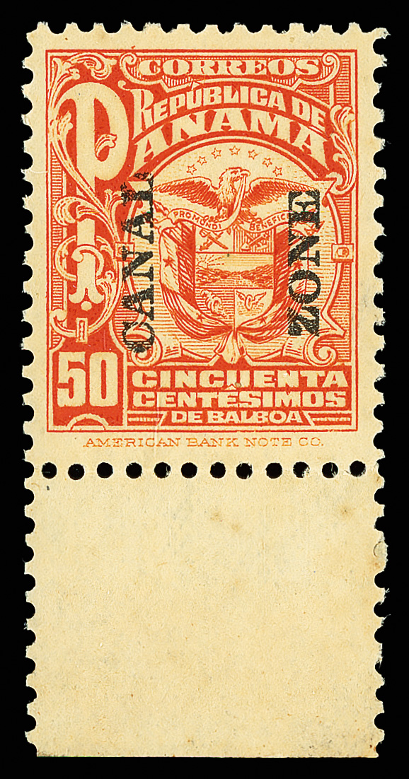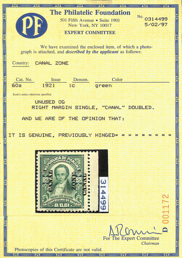 1793 og 60a image1921, 1c Vallarino, "CANAL" double (Scott 60a), right margin single, o.g., lightly hinged once, Very Fine small backstamp, only 10 were issued, all from the tenth vertical row of a pane of 100, with 1997 P.F. certificate.