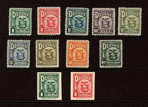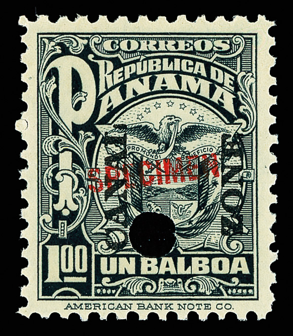 1800 nh 68S image1924, 1c Arms of Panama, dark green, Specimen, imperforate between pair (Scott 68S), each stamp with security punch hole at bottom left and red "Specimen" overprint at center, o.g., never hinged, bright color on fresh white paper, Very Fine, plate number F7428 noted in pencil on the reverse of both stamps as well as "B118" & "B119" on the left and right stamps, and probably unique. (Image)