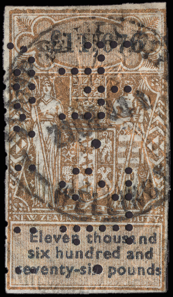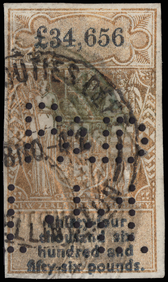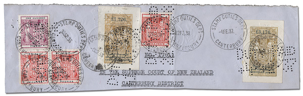 654 O R554 (2) image1935, Coat of Arms, Ultra High Values, £3,176 & £7,726 blue & gold (Kiwi R554 (2)), on a large piece of a document, both with full, 4mm margins, used with four stamps from the 1931 small Coat of Arms series totaling £160:4s; all tied by punched and Canterbury Stamp Duties Dept. c.d.s.s, 30 Sep 1936, Extremely Fine. An exceedingly rare item and a true showpiece.