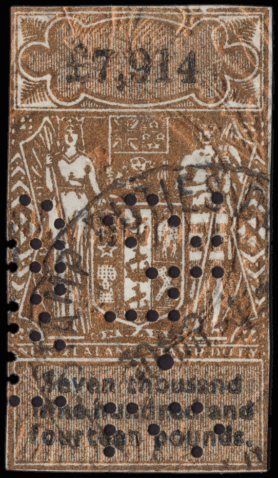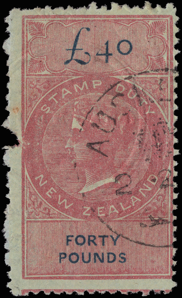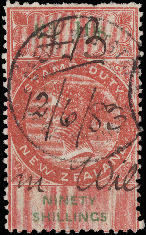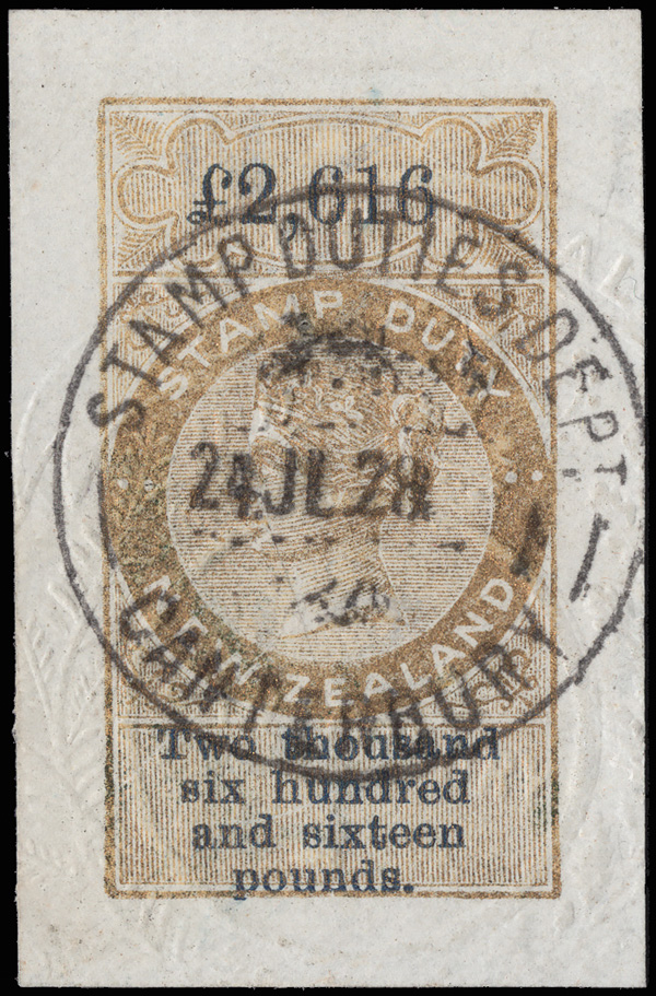 648 O R442 image1884, Queen Victoria, die II, Ultra High Value, imperf, £2,616 gold & blue (Kiwi R442), a choice, unpunched example with full, 4mm "boardwalk" margins; lightly embossed and "socked-on-the-nose" with a c.d.s., "Stamp Duties Dept., Canterbury, 24.JL.28", Extremely Fine.