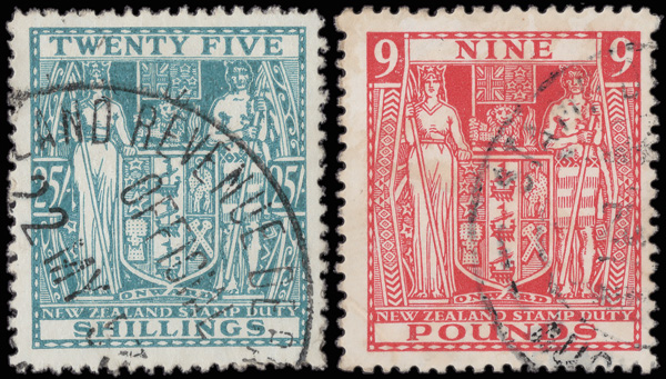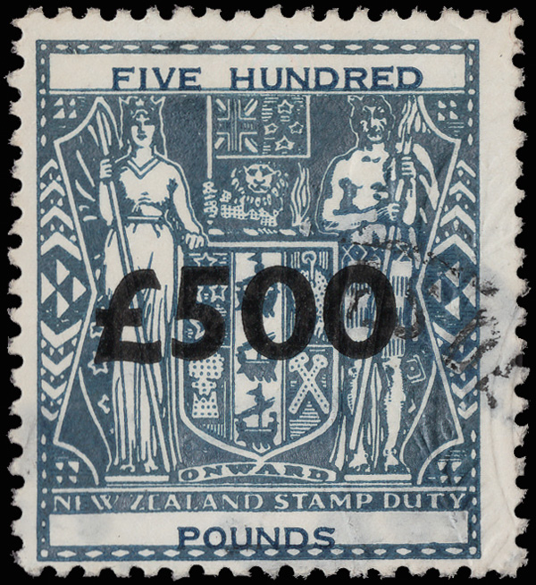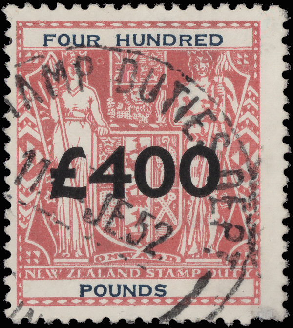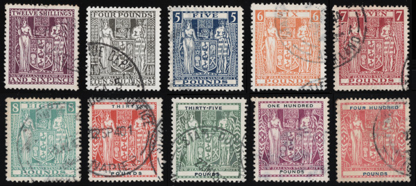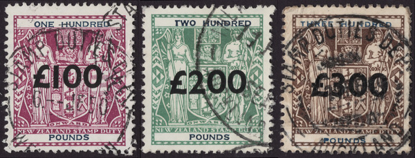 659 O R574-576, R579 image1939, Surcharged Coat of Arms, £100, £200, £300 & £500 (Kiwi R574-576, R579), handstamped Stamp Duty cancels only; £300 with a slightly rounded corner, otherwise Fine to Very Fine.